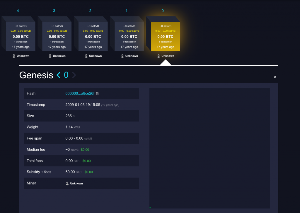 Satoshi Nakamoto schuf ihn am 3. Januar 2009. Er enthält eine versteckte Nachricht, die auf die Finanzkrise hinweist: „The Times 03/Jan/2009 Chancellor on brink of second bailout for banks“. Diese Zeile kritisiert das traditionelle Bankensystem. Sie zeigt Satoshis Vision einer dezentralen Währung, frei von Regierungen und Banken.